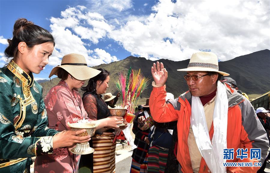 向來自遠方的新鄰居敬獻青稞酒(2018年6月18日攝)。經(jīng)過兩天的馳騁,11輛大巴和31輛大貨車緩緩駛?cè)肜_市堆龍德慶區(qū)古榮鄉(xiāng)嘎沖村,標(biāo)志著西藏首個高海拔生態(tài)搬遷項目正式實施。新華社記者覺果攝