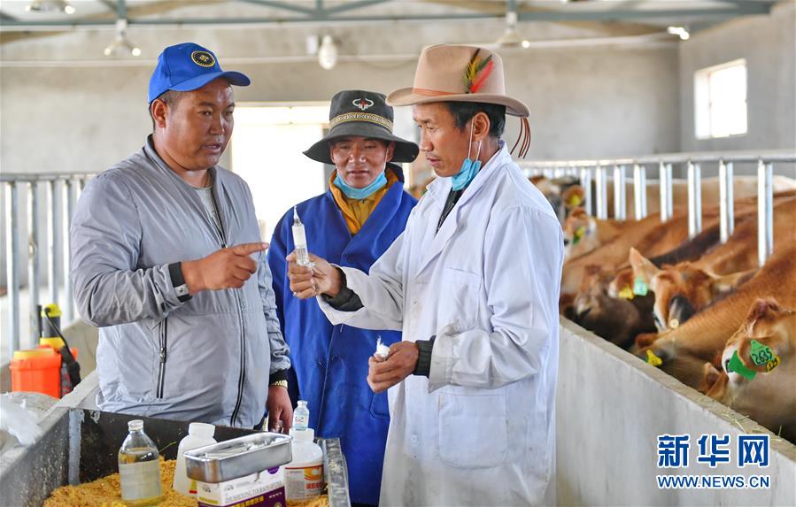 在阿里地區(qū)噶爾縣生態(tài)農(nóng)業(yè)產(chǎn)業(yè)園奶牛場,場長貢桑其美(左)和獸醫(yī)及飼養(yǎng)員商量牛群防疫事宜(2018年8月1日攝)。新華社記者張汝鋒攝
