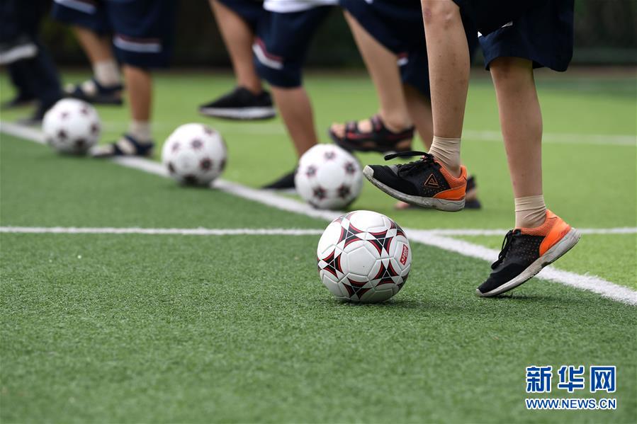 9月3日,金寨縣希望小學(xué)學(xué)生在足球課上訓(xùn)練。新華社記者張端攝