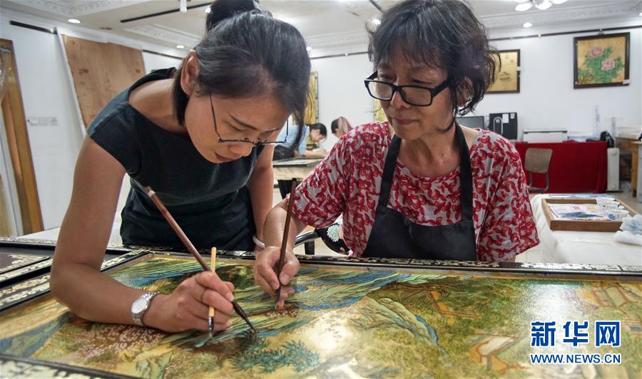 北京金漆鑲嵌有限責(zé)任公司工藝美術(shù)大師胡昕(右)在向?qū)W生傳授漆畫(huà)技藝(9月19日攝)。新華社記者李欣攝
