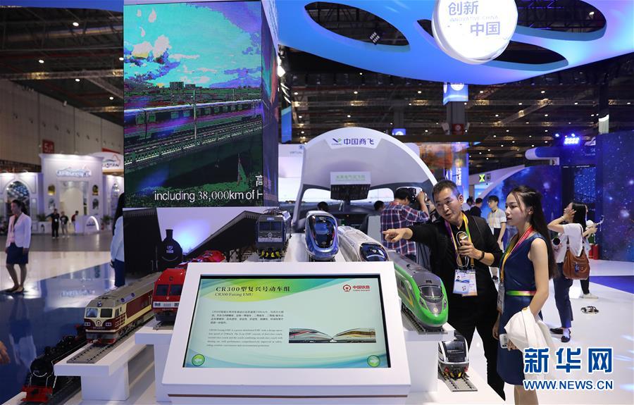 11月2日,在第二屆中國國際進口博覽會國家展展區(qū)內的中國館,工作人員在一組中國鐵路展品旁討論交流。 新華社記者 方喆攝