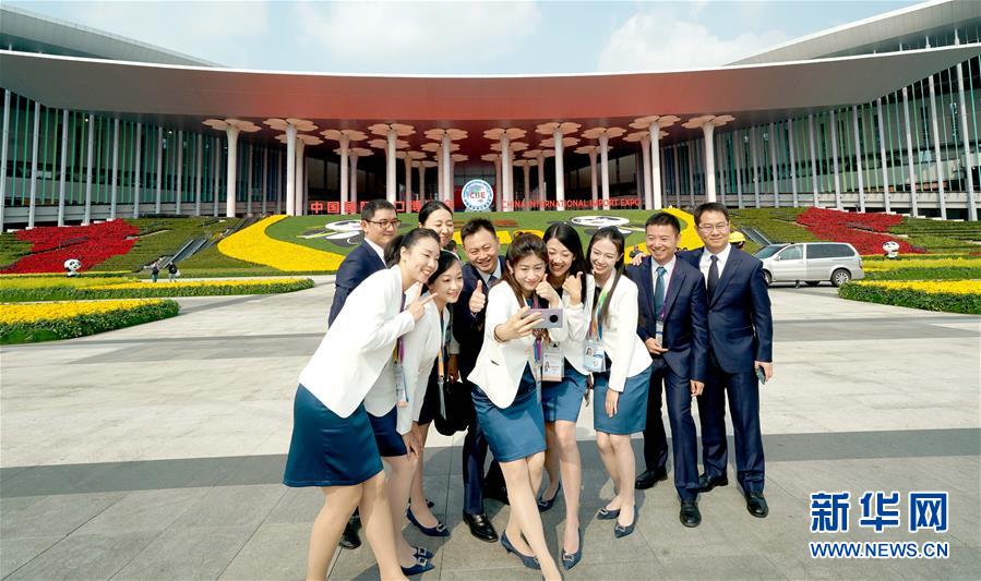 11月4日,第二屆中國國際進口博覽會中國館的工作人員在國家會展中心(上海)南廣場合影。新華社記者 陳建力 攝