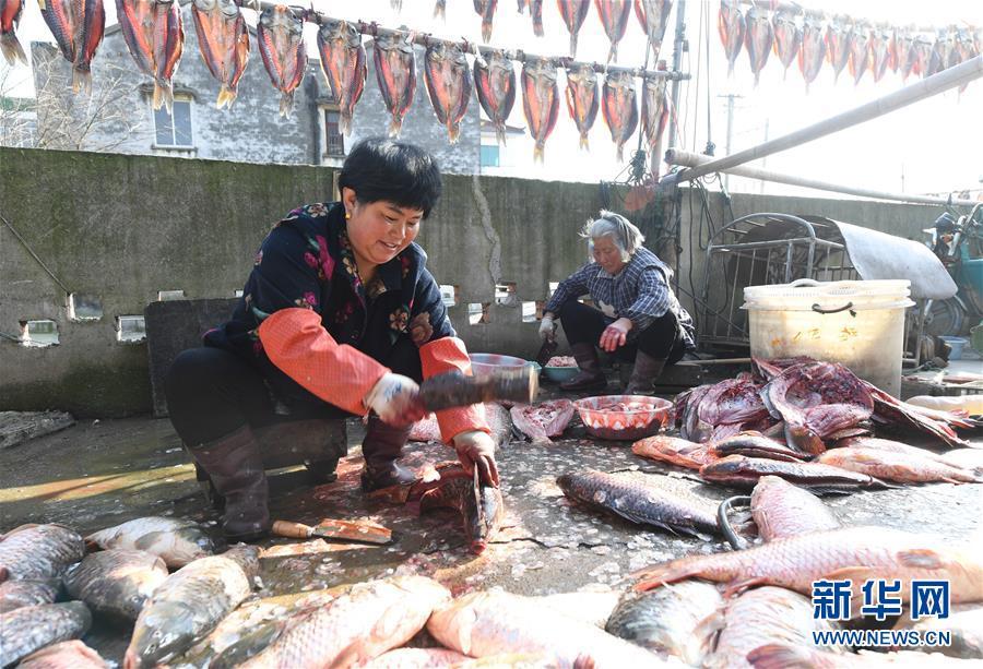 3月12日,浙江省湖州市吳興高新區(qū)幻溇村村民在剖魚準備腌制魚干。近日,太湖南岸湖州地區(qū)久雨初晴,漁民忙著制作、晾曬魚干。新華社記者翁忻旸攝