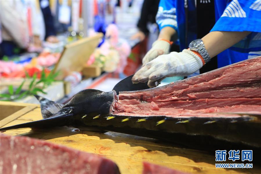 11月7日,來自日本長崎魚市株式會(huì)社的專業(yè)切魚師傅在現(xiàn)場解體70公斤藍(lán)鰭金槍魚。第二屆中國國際進(jìn)口博覽會(huì)正在上海國家會(huì)展中心舉行。博覽會(huì)的食品及農(nóng)產(chǎn)品展區(qū)里匯集了來自世界各地的美食,同時(shí)也上演各種精彩美食秀。11月7日,來自日本長崎魚市株式會(huì)社的專業(yè)切魚師傅現(xiàn)場解體一條70公斤的藍(lán)鰭金槍魚,吸引大量參觀者觀看、品嘗。新華社記者隋先凱攝