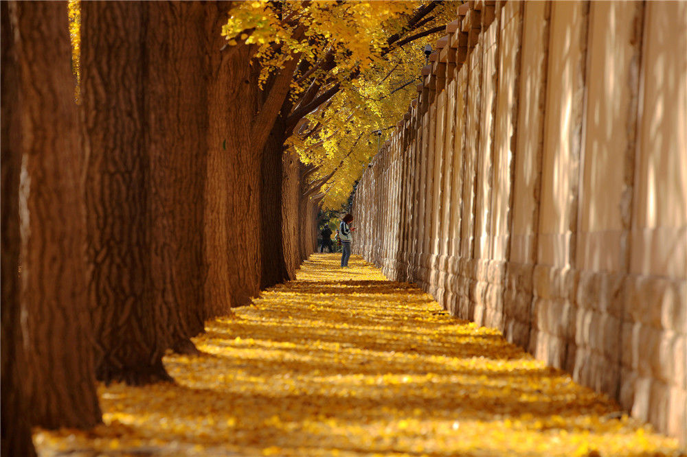 2019年11月11日,北京,西城區(qū)三里河數(shù)百米銀杏大道一片金黃,吸引眾多游人欣賞拍照。