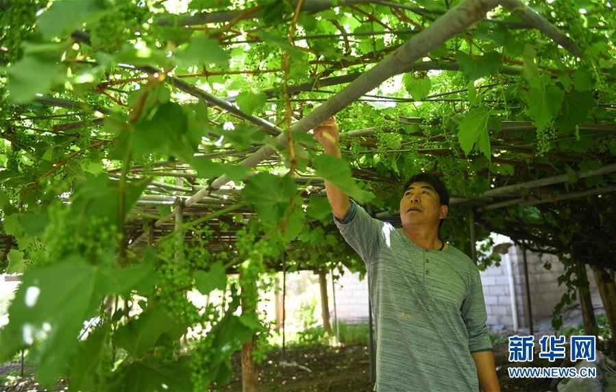 建廠生產(chǎn)并注冊(cè)“丁德良”牌干紅葡萄酒品牌的魯仁弟介紹他家里一棵樹(shù)齡超過(guò)百年的葡萄樹(shù)(6月3日攝)。新華社記者晉美多吉攝