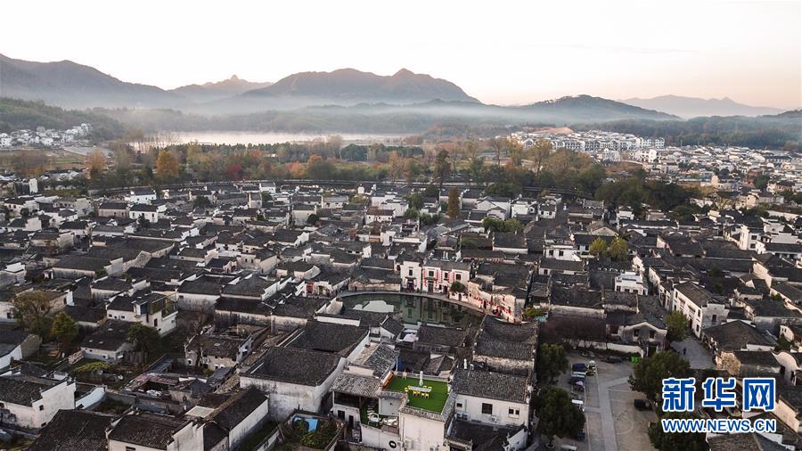 這是11月15日無(wú)人機(jī)拍攝的安徽黟縣宏村晨景。新華社記者張笑宇攝