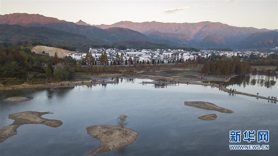 11月14日拍攝的安徽黟縣奇墅湖晨景(無(wú)人機(jī)航拍)。新華社記者張笑宇攝