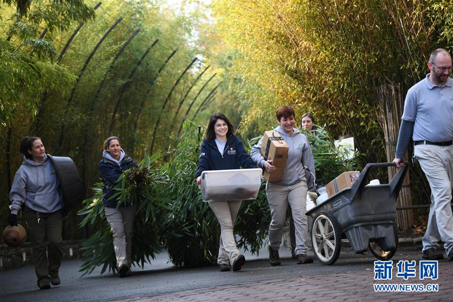 11月19日,在美國華盛頓的美國國家動物園,飼養(yǎng)員運送竹子、水果、飲用水等,供“貝貝”飛行期間食用。 新華社記者 劉杰 攝