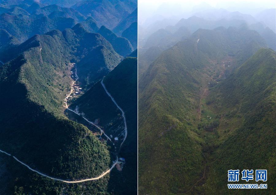 拼版照片:左圖為剛剛修通水泥路的大化瑤族自治縣板升鄉(xiāng)八好村弄研屯(11月11日無人機拍攝);右圖為尚未通路的八好村弄研屯(2015年11月3日無人機拍攝)。新華社記者黃孝邦攝