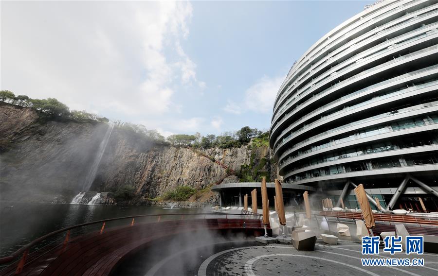 一條人造瀑布從酒店主體建筑旁的礦坑頂部流下(11月13日攝)。新華社記者方喆攝