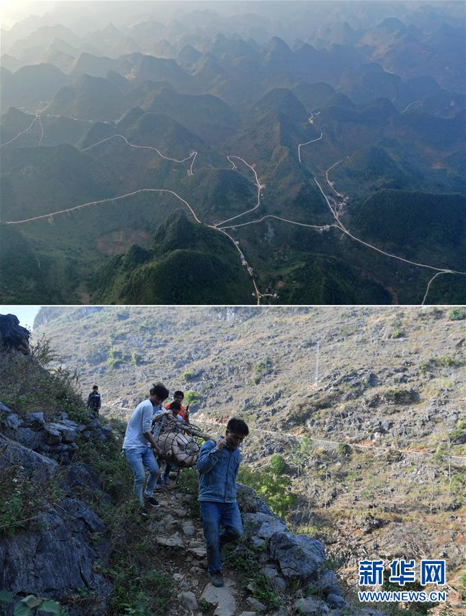 拼版照片:上圖為已經(jīng)通路的大化瑤族自治縣七百弄鄉(xiāng)弄雄村弄桃屯以及周邊村屯(11月10日無人機拍攝);下圖為在尚未通路的弄雄村弄桃屯,村民抬著準備出售的土豬走在山路上(2016年12月8日攝)。新華社記者黃孝邦攝