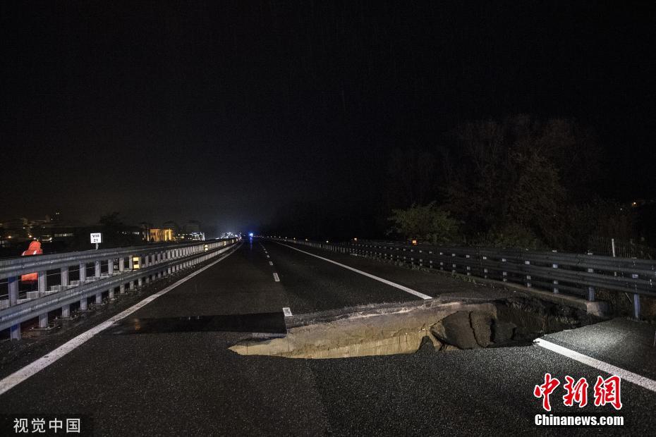 當?shù)貢r間2019年11月24日,意大利Villafranca dAsti,意大利遭受惡劣天氣和持續(xù)多日的暴雨,通往都靈方向的A21高速公路路面出現(xiàn)“大坑”。圖片來源:視覺中國