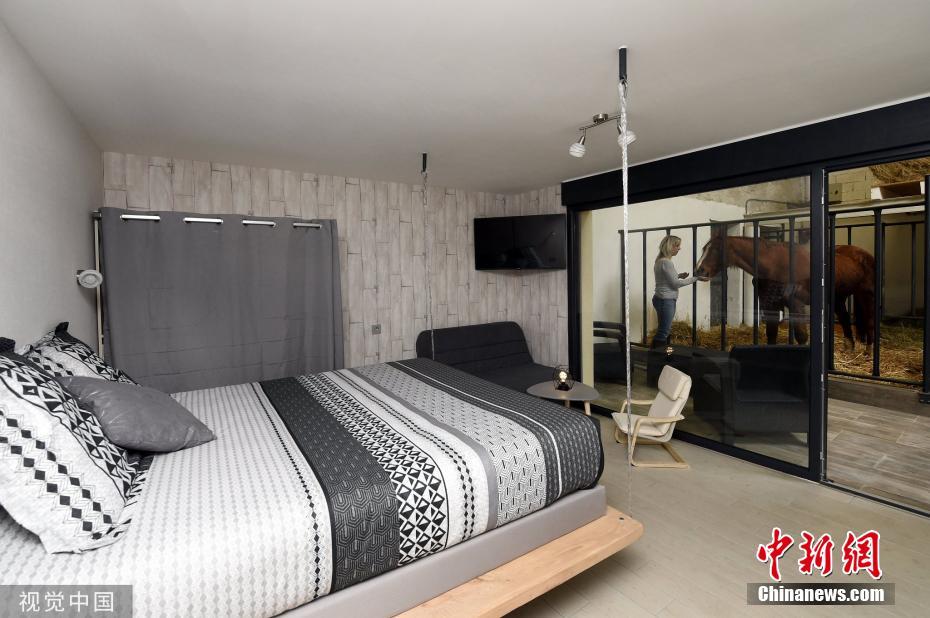 當地時間2019年11月25日,法國桑圖瓦地區(qū)弗賴斯內,一家特別的“酒店”開張,入住者可以透過玻璃清楚的看到馬廄里的馬,還可以跟馬親密接觸。圖片來源:視覺中國