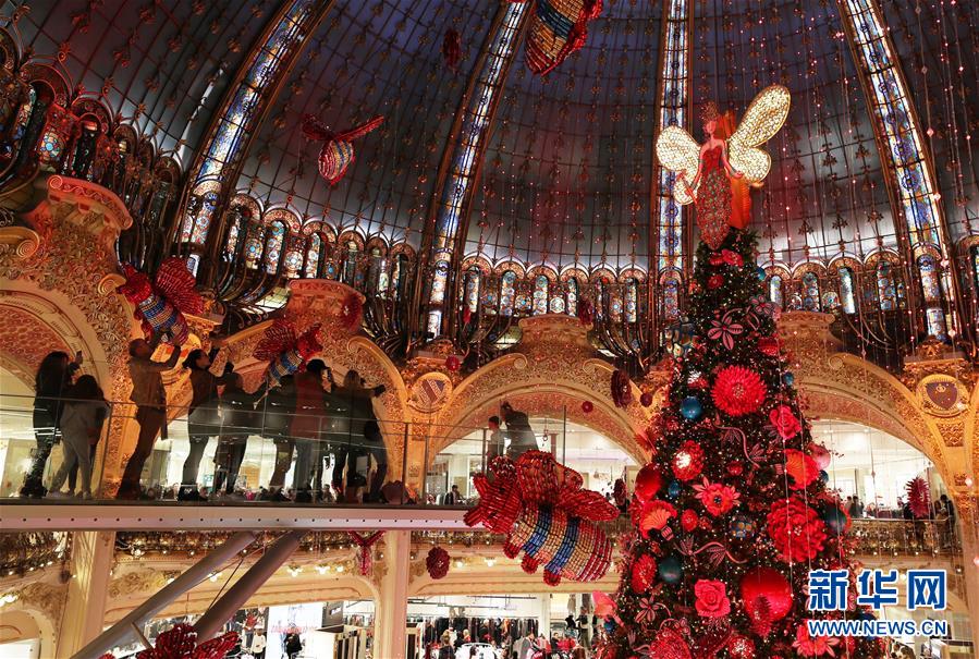 11月24日,在法國巴黎老佛爺百貨公司,人們?cè)诓Aё呃壬蠀⒂^點(diǎn)燈后的巨型圣誕樹。 新華社記者高靜攝