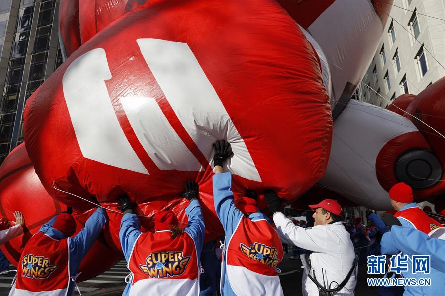 11月28日,在美國(guó)紐約舉行的感恩節(jié)大游行上,工作人員試圖控制氣球。 新華社記者 李木子 攝