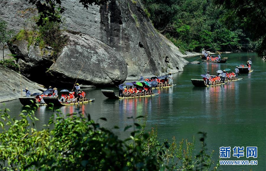 8月23日,游客在武夷山九曲溪乘竹筏游覽。新華社記者張國(guó)俊攝