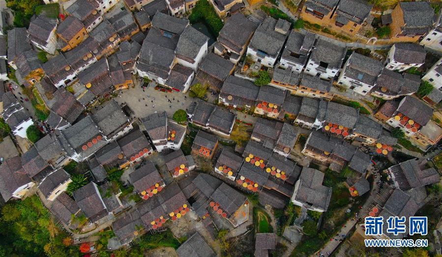 這是婺源縣江灣鎮(zhèn)篁嶺村的曬秋景象(11月7日無人機(jī)拍攝)。新華社記者胡晨歡攝