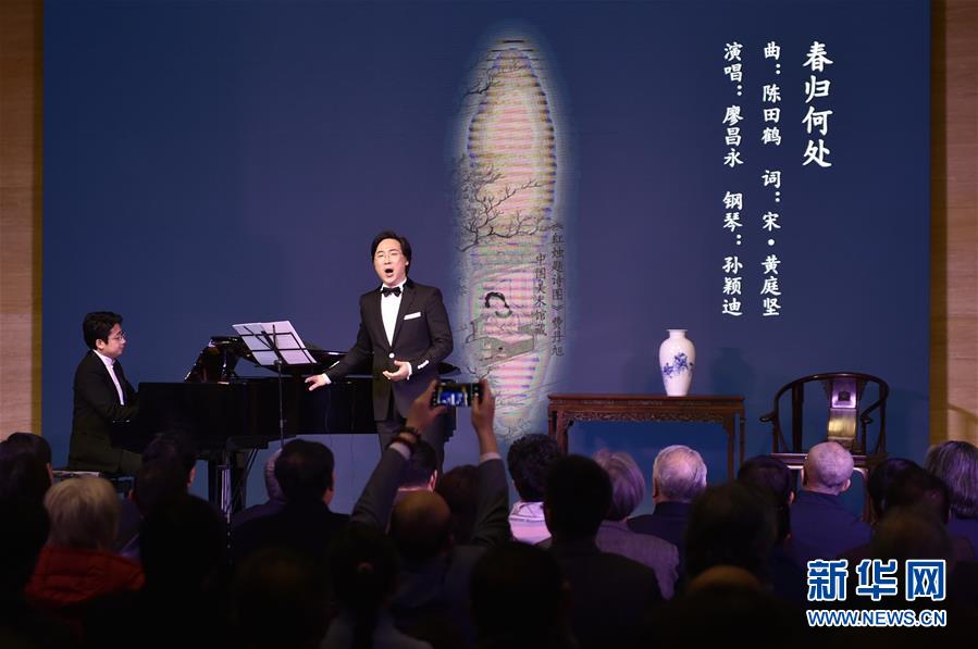 12月10日晚,廖昌永在音樂(lè)會(huì)上演唱《春歸何處》。 當(dāng)晚,中國(guó)古典詩(shī)詞與書畫——廖昌永中國(guó)藝術(shù)歌曲獨(dú)唱音樂(lè)會(huì)在北京中國(guó)美術(shù)館舉行。 新華社記者 魯鵬 攝