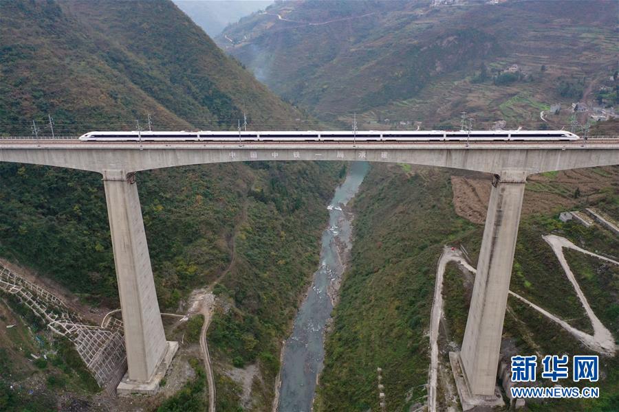 一輛成貴高鐵測(cè)試列車駛過香壩河特大橋(12月3日無人機(jī)拍攝)。新華社記者劉續(xù)攝