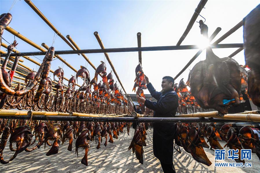 初冬時節(jié),浙江省紹興市柯橋區(qū)安昌古鎮(zhèn)開啟了傳統(tǒng)臘味制作、上市的季節(jié)。當?shù)匕傩沼脗鹘y(tǒng)醬油、黃酒、香料等手工腌制臘腸、醬鴨、魚干、醬鵪鶉、醬排骨等紹興特色醬貨,在冬季的陽光下進行晾曬,滿街飄香的臘味也成了這座江南古鎮(zhèn)的獨特風景。安昌古鎮(zhèn)是浙江省歷史文化名鎮(zhèn),有著一千多年歷史,比較完善地保存了古吳越地區(qū)沿襲千百年來的民俗風情。每年大雪節(jié)氣前后,安昌當?shù)匕傩瞻凑諅鹘y(tǒng)習俗挑選晴朗好天氣制作、晾曬傳統(tǒng)醬貨,各類醬貨顏色黑紅油亮,咸鮮適口,是當?shù)囟镜奶厣珎鹘y(tǒng)美食。新華社記者徐昱攝