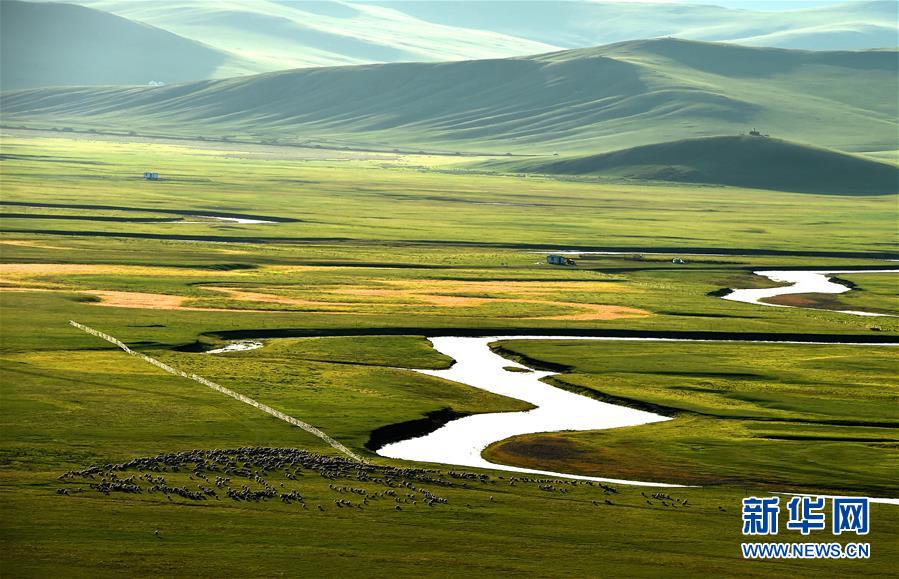 8月29日無(wú)人機(jī)拍攝的內(nèi)蒙古呼倫貝爾市陳巴爾虎旗境內(nèi)的莫日格勒河與羊群。新華社記者李京攝