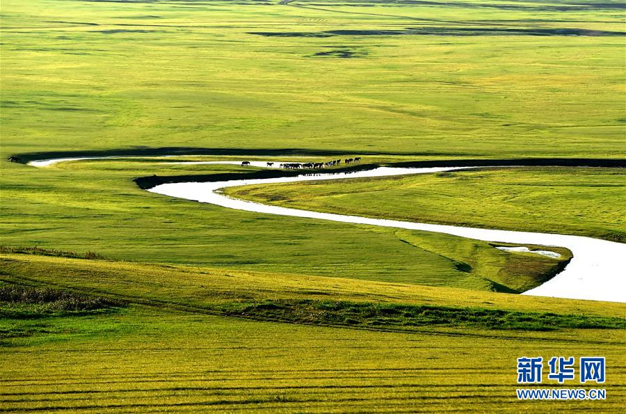 8月26日無(wú)人機(jī)拍攝的伊敏河(全景照片)。伊敏河流經(jīng)呼倫貝爾草原。新華社記者沈伯韓攝