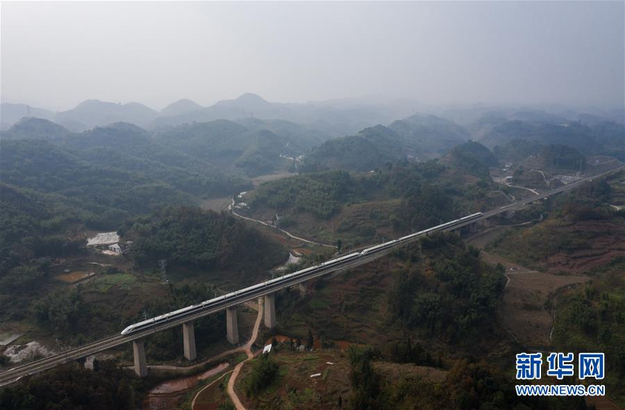 12月16日,C6046次列車通過成貴高鐵興文縣段(無人機拍攝)。新華社記者江宏景攝