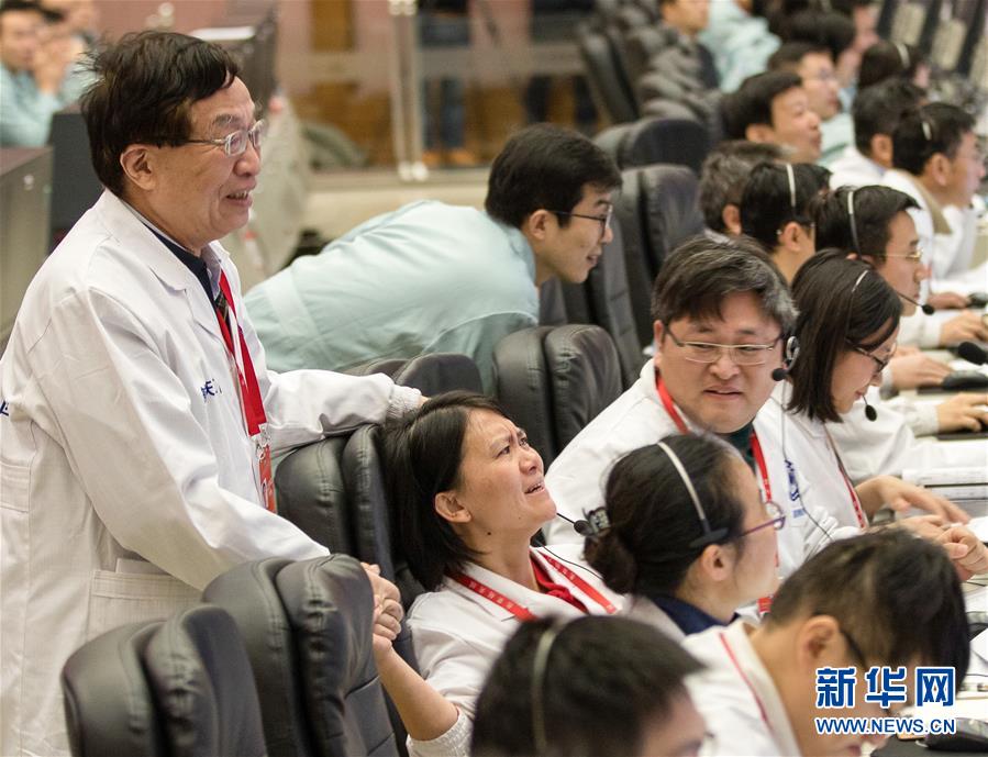 1月3日,嫦娥四號成功落月的那一刻,74歲的中國航天科技集團五院深空探測和空間科學首席科學家、嫦娥一號衛(wèi)星總設計師葉培建院士(左一)靜靜走到嫦娥四號探測器項目執(zhí)行總監(jiān)張熇的身后,對她表示祝賀和鼓勵。兩代“嫦娥人”的手緊緊握在了一起。新華社記者金立旺攝