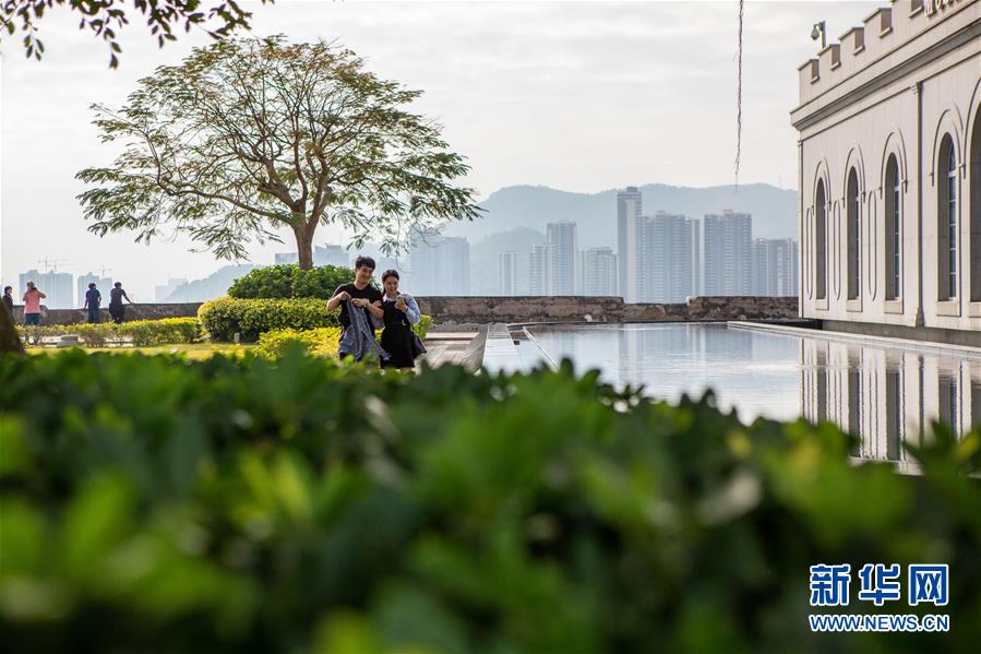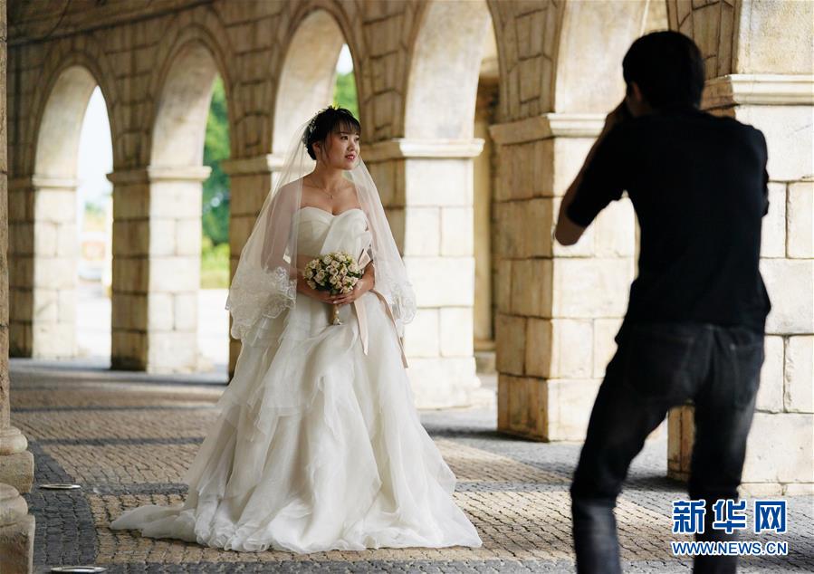 12月17日,女子穿著婚紗在澳門漁人碼頭拍照。新華社記者王申攝