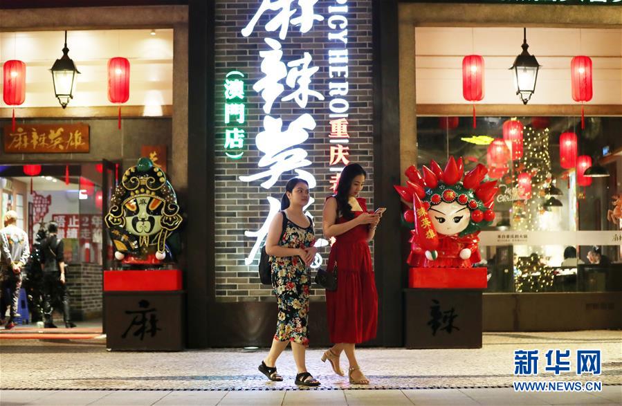 12月17日,在澳門漁人碼頭附近,人們從一家火鍋店門前經(jīng)過。新華社記者李鋼攝