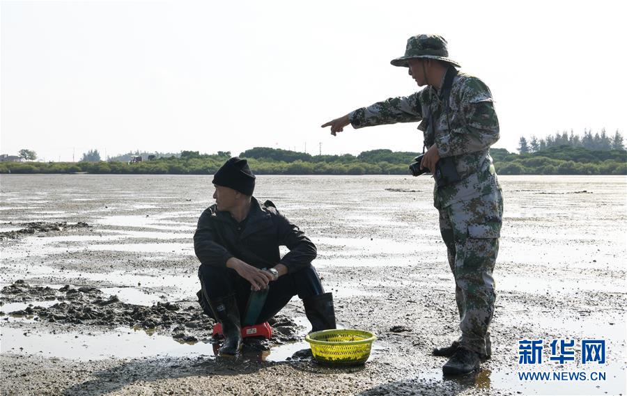 海南儋州新英灣紅樹林市級(jí)自然保護(hù)區(qū)護(hù)林員陳正平(右)在保護(hù)區(qū)內(nèi)的灘涂上向村民普及紅樹林濕地相關(guān)知識(shí)(12月10日攝)。陳正平2010年開始在保護(hù)區(qū)工作,他將工作發(fā)展成愛好,廣泛參加各種培訓(xùn)和業(yè)內(nèi)交流。他在工作中拍到瀕危鳥類白肩雕出現(xiàn)在海南的照片,這刷新了海南省的鳥種記錄。新華社記者楊冠宇攝