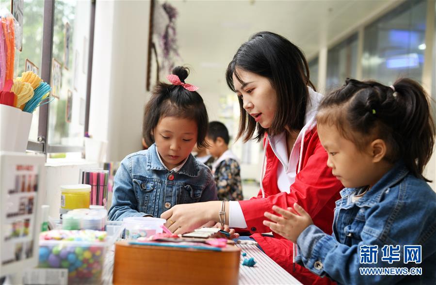在貴州省正安縣瑞濠街道易地扶貧搬遷安置點(diǎn)的一所幼兒園,老師指導(dǎo)小朋友做手工(10月11日攝)。新華社記者 楊文斌 攝