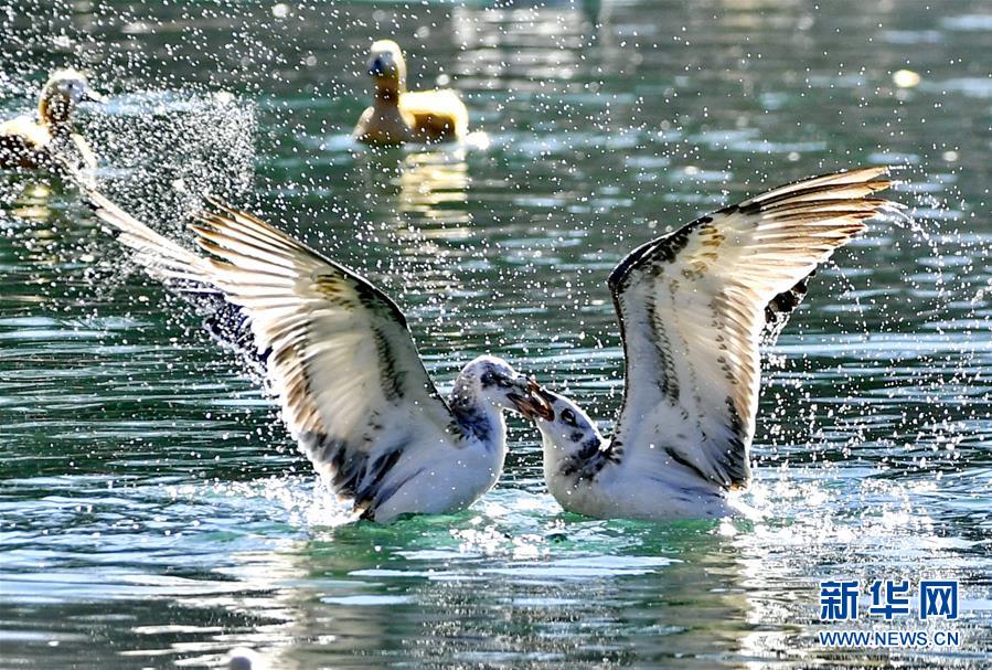 11月21日,候鳥在拉薩龍王潭公園水中嬉戲。時(shí)下,斑頭雁、紅嘴鷗等不少候鳥陸續(xù)飛抵拉薩河谷、雅魯藏布江沿岸等地避寒。新華社記者普布扎西攝