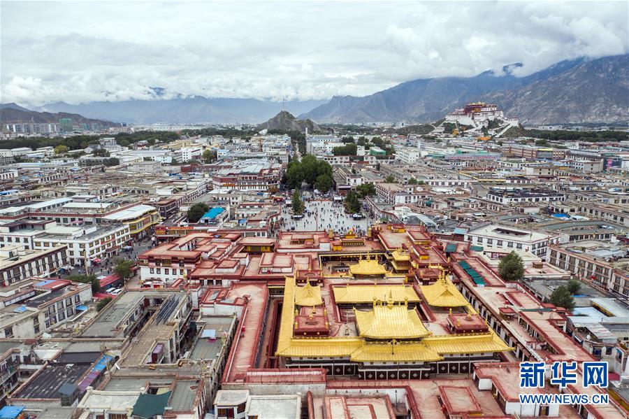 8月10日無人機(jī)拍攝的大昭寺和布達(dá)拉宮。新華社記者王建華攝