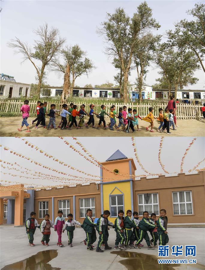 拼版照片:上圖為新疆于田縣達(dá)里雅布依鄉(xiāng)小學(xué)的學(xué)生走在校園里(2018年9月5日攝);下圖為學(xué)生們?cè)谶_(dá)里雅布依小鎮(zhèn)易地扶貧安置點(diǎn)的新校舍前(2019年3月20日攝)。新華社記者胡虎虎攝