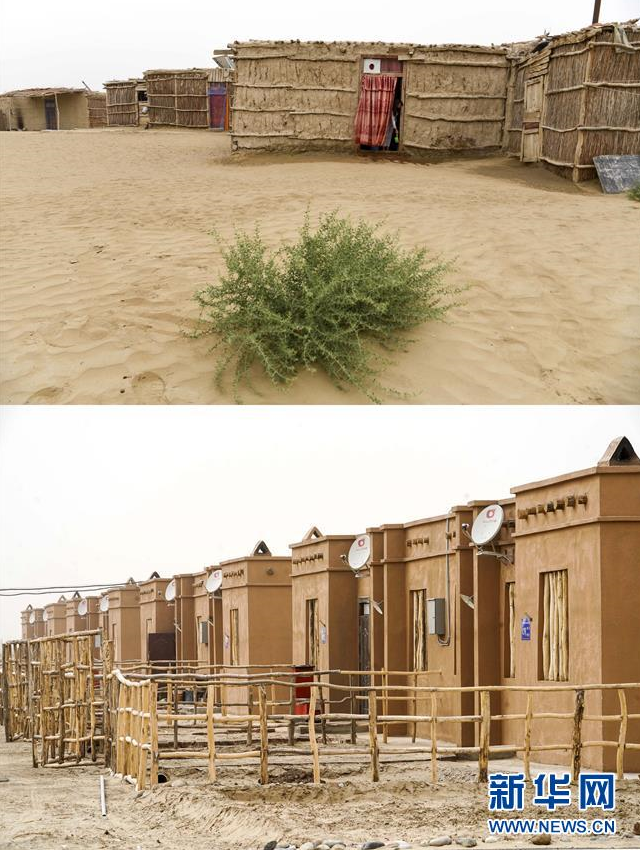 拼版照片:上圖為新疆于田縣達里雅布依鄉(xiāng)的民居(2018年9月7日攝);下圖為達里雅布依小鎮(zhèn)易地扶貧安置點的房屋(2019年3月20日攝)。新華社記者胡虎虎攝
