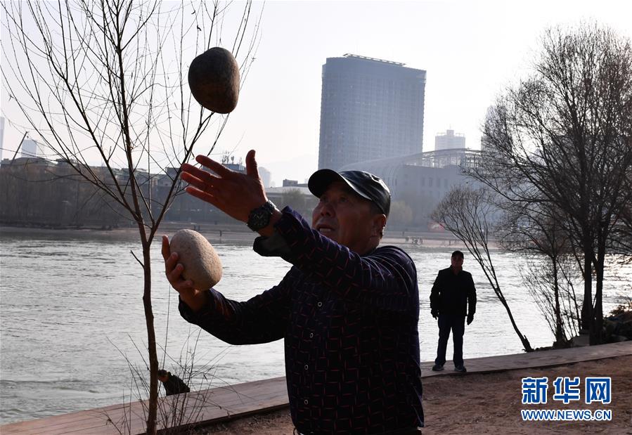 12月20日,冬泳愛(ài)好者趙子銀冬泳后在岸邊扔石頭暖身。新華社記者賀長(zhǎng)山攝