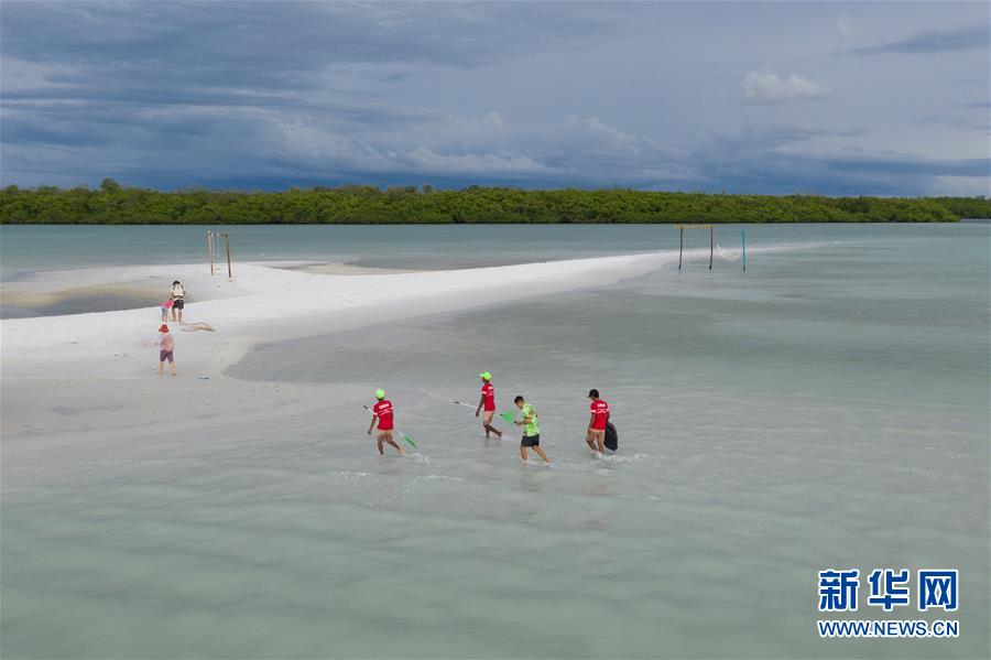 12月8日,在印度尼西亞邦加勿里洞省,李嘉文(右二)帶領(lǐng)工人在李王島的白色海床清理垃圾。(無人機(jī)拍攝) 新華社記者杜宇攝