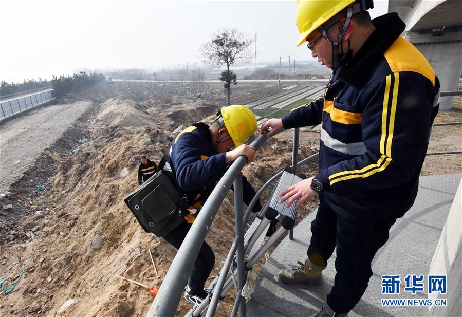 1月3日,中國(guó)鐵路濟(jì)南局臨沂工務(wù)段工程技術(shù)員準(zhǔn)備對(duì)沂河特大橋橋墩進(jìn)行檢查。新華社記者 朱崢攝