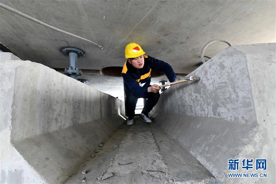 1月3日,中國(guó)鐵路濟(jì)南局臨沂工務(wù)段工程技術(shù)員李奔騰在沂河特大橋橋梁連接處檢查。新華社記者 朱崢攝