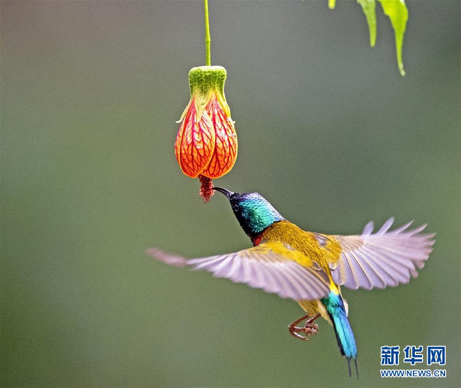 在福州市西湖公園,一只叉尾太陽鳥在狀如燈籠的懸鈴花前懸停、采蜜(1月3日攝)。 新華社記者梅永存攝