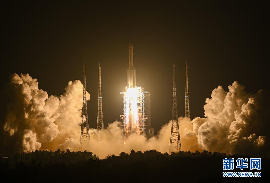 2019年12月27日20時(shí)45分,長(zhǎng)征五號(hào)遙三運(yùn)載火箭在中國(guó)文昌航天發(fā)射場(chǎng)點(diǎn)火升空。 新華社記者陳曄華攝