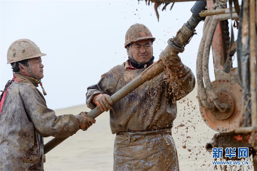 1月13日,鉆井工在連接鉆桿。地球物理勘探是油氣開(kāi)發(fā)的第一步,相當(dāng)于給地球做CT。物探工人按照嚴(yán)格的測(cè)線部署,在相應(yīng)位置鉆井,然后實(shí)施地震,采集地震波數(shù)據(jù)??蒲腥藛T通過(guò)數(shù)據(jù)組成的“CT片”,就能夠清晰地“看”到地下的地質(zhì)結(jié)構(gòu),判斷哪里埋藏有石油或者天然氣。2019年10月,東方地球物理勘探有限責(zé)任公司塔里木物探處2113隊(duì)進(jìn)入新疆塔克拉瑪干沙漠腹地,開(kāi)始中古14-21、塔中2兩個(gè)區(qū)塊的三維地震勘探。近2000名物探工人將在1000平方公里的范圍內(nèi)一直工作到2020年4月,這也意味著他們將在塔克拉瑪干沙漠腹地連續(xù)度過(guò)第14個(gè)除夕夜。蘊(yùn)藏著豐富石油天然氣資源的新疆塔克拉瑪干沙漠有“死亡之?!敝Q(chēng),氣候干燥,年降水量在50毫米以下,冬季地表最低溫度超過(guò)零下30攝氏度,是世界油氣勘探難度最大的地區(qū)之一。為避開(kāi)風(fēng)季,物探工人每年9、10月份進(jìn)入沙漠,一直工作到來(lái)年4月,夜以繼日與黃沙、嚴(yán)寒為伴,用辛勤的汗水,為祖國(guó)找油找氣。新華社記者丁磊攝