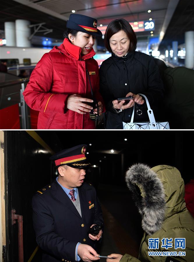 拼版照片上圖:在西安北站,列車長(zhǎng)陳海燕(左)幫助旅客在手機(jī)上購買火車票(新華社記者詹彥1月11日攝);下圖:在陽泉北站,列車長(zhǎng)趙耀(左)為旅客檢票(新華社記者楊晨光1月11日攝)。新華社發(fā)
