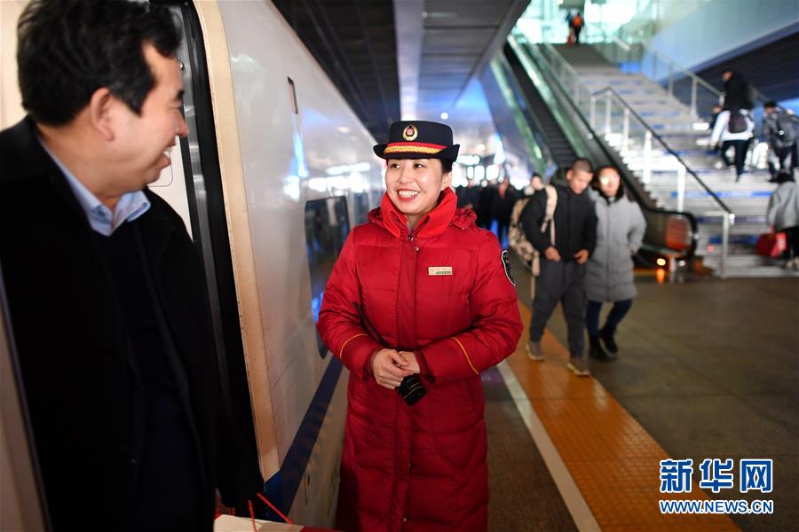 1月11日,在西安北站,列車長(zhǎng)陳海燕在站臺(tái)上目送旅客下車。新華社記者 詹彥 攝