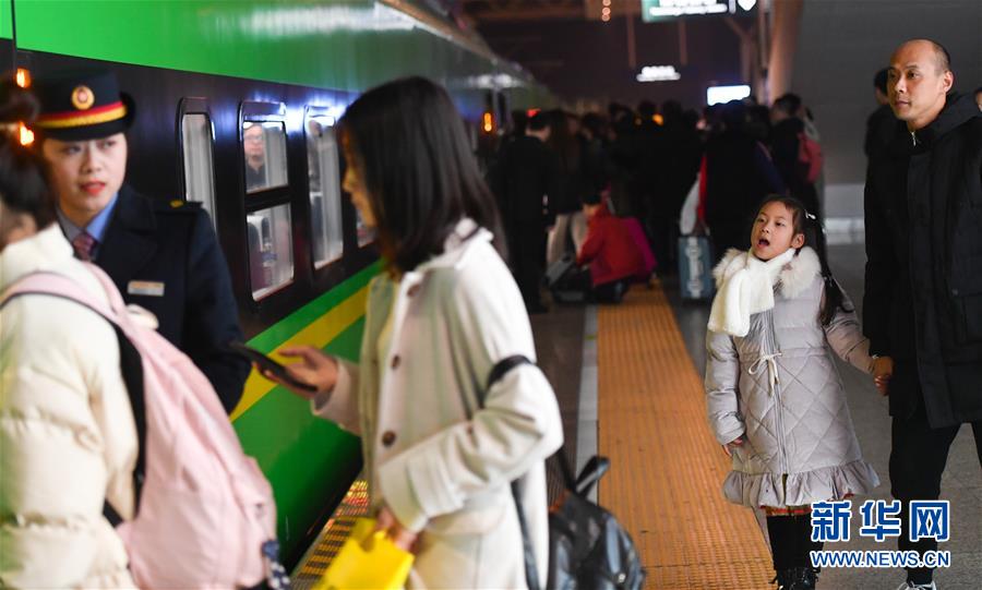 1月3日,卞菁值乘的動(dòng)車到站,朱梓芮(前右)和父親尋找卞菁的身影。新華社記者 胡晨歡 攝
