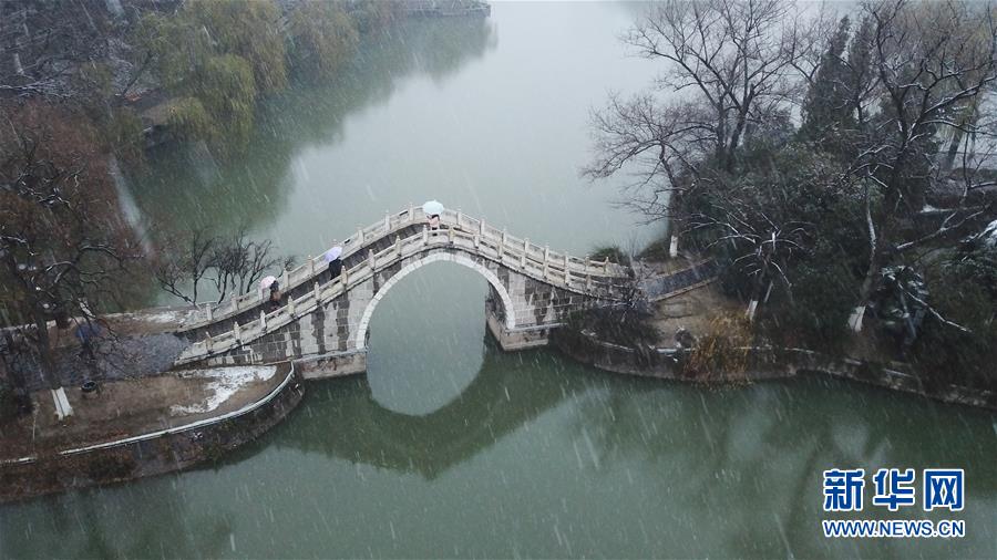 1月15日,幾名游客在雪中的合肥市包公園參觀(無人機(jī)照片)。 當(dāng)日,安徽省合肥市迎來降雪天氣。雪中的合肥市包公園景色別致。 新華社記者 張端 攝