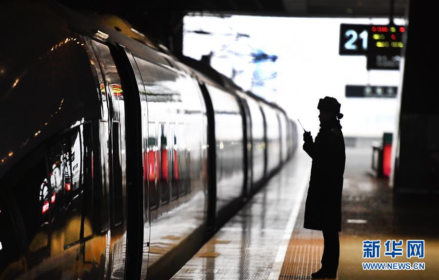 吉如在西安北站站臺(tái)上,與檢票口客運(yùn)人員聯(lián)控(1月14日攝)。今年春運(yùn)列車開(kāi)行密度大,站臺(tái)崗位人員緊張,吉如時(shí)常被調(diào)到站臺(tái)進(jìn)行站臺(tái)服務(wù)工作。新華社記者陶明攝