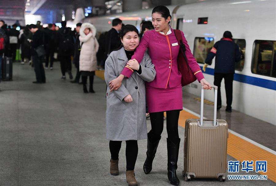 盲人姑娘吳瀟(左)從西安北站中轉(zhuǎn)回延安老家,得到吉如的溫馨服務(wù)。臨別時(shí),吳瀟激動(dòng)地說(shuō):“小姐姐,你的服務(wù)太貼心了,我看不見(jiàn)你,能摸摸你的臉頰嗎?”(1月15日攝)。新華社記者陶明攝